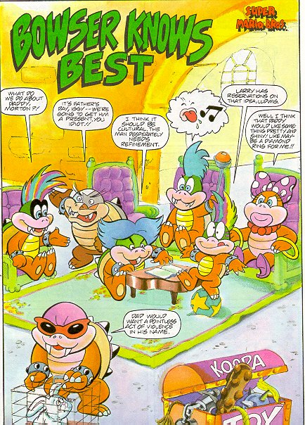 アメリカで発行されていたコミック『Nintendo Comics System』では、ラリーのセリフは理由は定かではありませんが英語ではありませんでした。っていうか、音声なのかどうかもよく判らない……文字ではなく絵で表記されていたので。そして、レミーだけがそれを理解できるという設定でした。例えばここに引用した、父の日のプレゼントについて相談するコクッパたちの会話では、ルドウィッグがおもちゃのピアノを弾きつつ「文化的なものであるべきだと思うぞ。父上は洗練されたものを切望なさっているんだ」と言うのを受けて発せられた「音符に向かって舌を出している絵」で表わされるラリーのセリフを、レミーが「ラリーはそのアイデアは保留しとくんだって、ルドウィッグ」と通訳しています。アニメではイギーの双子になっていたレミーですが、このコミックではラリーと関係が深かったようですね。しかしこのマンガ、クッパはアニメ版の全身緑のアレなんですよ。コクッパたちはゲーム寄りの容姿なのに、なぜ……?
